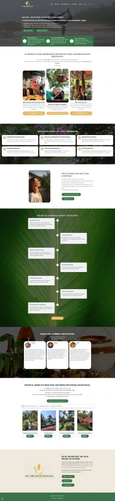 Das Hauptziel war die Entwicklung einer emotionalen und klar strukturierten Webseite, die das Thema Ayurveda-Kuren in Indien authentisch vermittelt, Vertrauen aufbaut und eine einfache Buchung von Beratungsterminen ermöglicht. Die Zielgruppe: gestresste Berufstätige (vor allem Frauen 40+), die Interesse an natürlichen Heilmethoden und innerer Transformation haben.